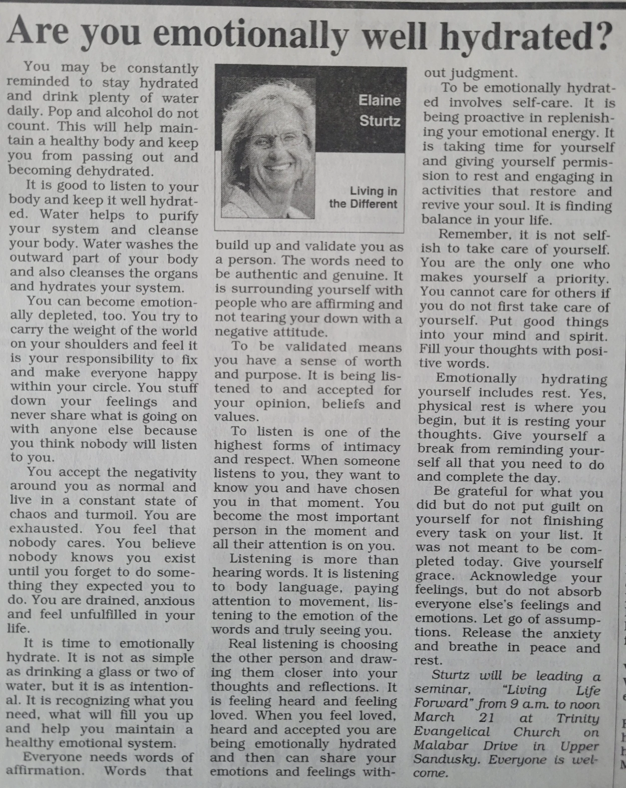 Elaine will be leading a seminar – “Living Life Forward” on Saturday, March 21st from 9 AM to 12 pm at Trinity Evangelical Church on Malabar Drive in Upper Sandusky. Everyone is welcome.
