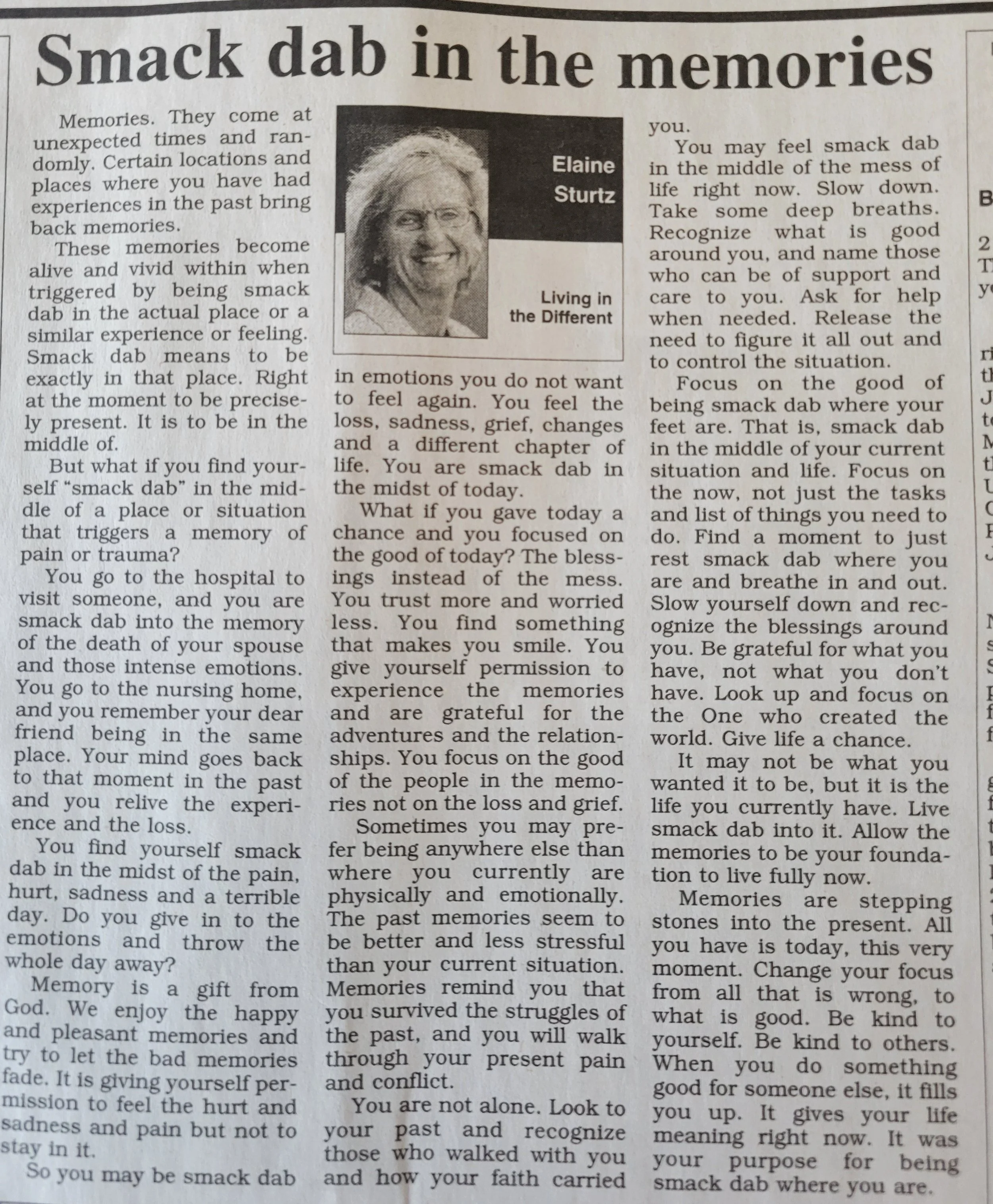 But what if you find yourself “smack dab” in the middle of a place or situation that triggers a memory of pain or trauma? You go to the hospital to visit someone, and you are smack dab into the memory of the death of your spouse and those intense emotions. You go to the nursing home, and you remember your dear friend being in the same place. Your mind goes back to that moment in the past and you relive the experience and the loss.